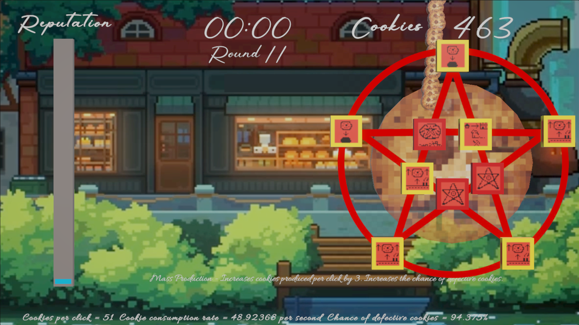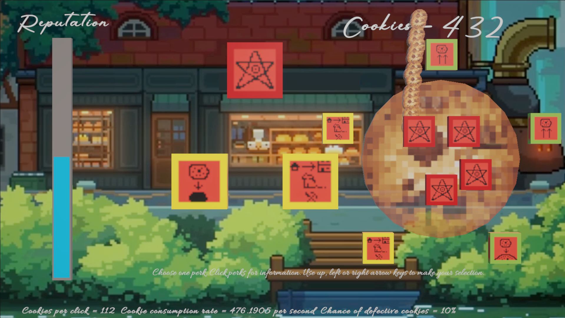 Every round, you must keep your cookie supply above zero or risk losing reputation. The large cookie is your source of cookies and can be upgraded with perks as rewards after each round. (Click for more information, Select using the up, right and left arrow keys.)